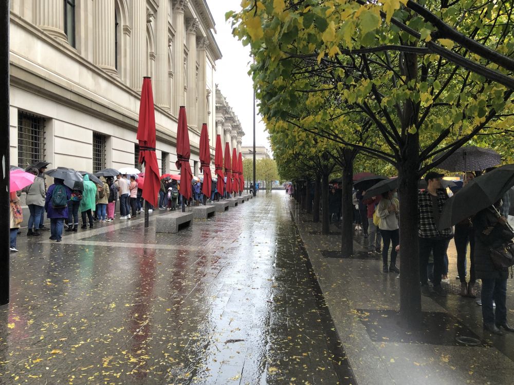 2021-11-12近两年没有去去纽约大都会艺术博物馆,老想着抽空去逛逛。昨天不是周末,又下着雨,心想人少一点。于是开车去车站,挤地铁、打伞踩水冒的而去。到门口才发现从来未见过这么长的队,从门前台阶下向一侧两个街区,再转回来。大家都不上班,还是刚刚开放美国国门以后来的外国游客?雨中排了近一个小时才进门。前一阵子自己出版一本《古希腊哲学家的奇事趣[