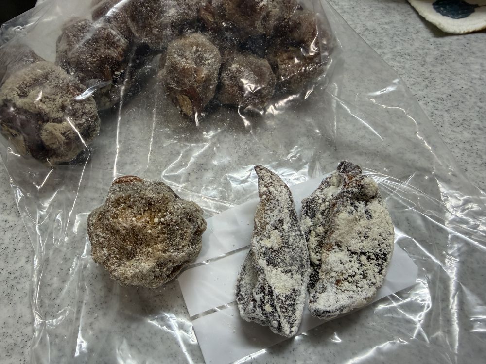 看图说话啊,柿子的种类不同,出糖霜的程度不同。下面的小圆球,是甜柿,糖霜出的晚,要到3月份才能在外面挂满糖霜。切开的涩柿,就是专门用来晒柿子饼。个头太大,同时晒的,涩柿糖霜就很多。两种糖霜的口感不同,糖霜的样子也不同。甜柿比较不容易晒干,里面还有籽,所以糖霜没有涩柿(无籽的多)的多,切口感稍有不同。但是都好吃啊。