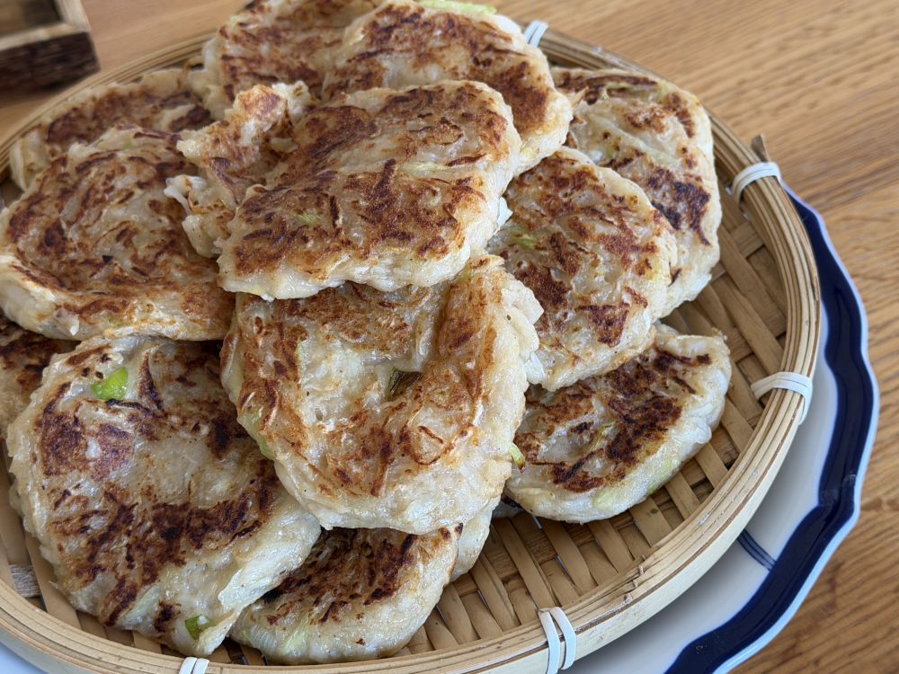 二月末是最忙的时节。反正在国外也没有什么正月不正月的。只是现在可以在家工作了,有不需要必须去公司的日子,可以偶尔在家工作一天。很久没有去地里,周末在家工作,领导去地里拔了两根萝卜,就做了这个萝卜丝饼。还好不用很多的油。配比:两根萝卜插丝,焯水后过冷水,脱水。正好家里没鸡蛋了,就只放了三大勺面粉,两勺土豆淀粉,盐,胡椒粉,五香粉,葱[