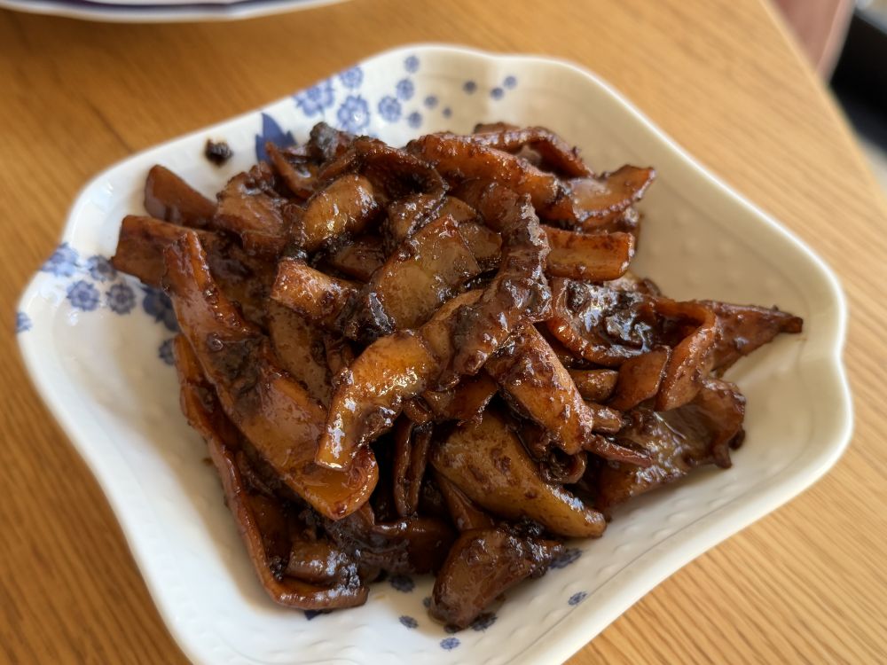 前几天有人问我,小鱿鱼是多大的。其实这个也没有什么严格的标准,就是商场里买的比较大的,是俄罗斯进口的那种,很大肉质肥厚,做这个奶油鱿鱼收汁后,掌握不好火候,太干的话会比较硬。用这种小鱿鱼,肉质比较薄,收汁后即使火候过了也不会硬,口感还是软嫩的。成品后来买了同款的小鱿鱼,大概尺寸就这个样子吧。比这个小的也可以哦。我不太喜欢须子部分,[