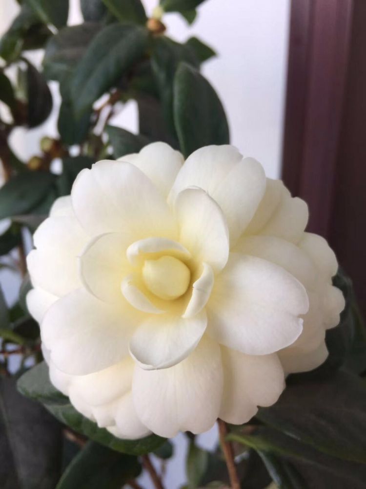 冬天北方室内养茶花的诀窍在于控制周围空气相对湿度在65~85%。湿度太小,容易落蕾,起码造成花蕾在开花以前显得半死不活的;如果湿度太大,花朵太重容易在凋谢之前就跌落。剩下的,就是摄影师的事情了。我非摄影师,这用手机拍的。[