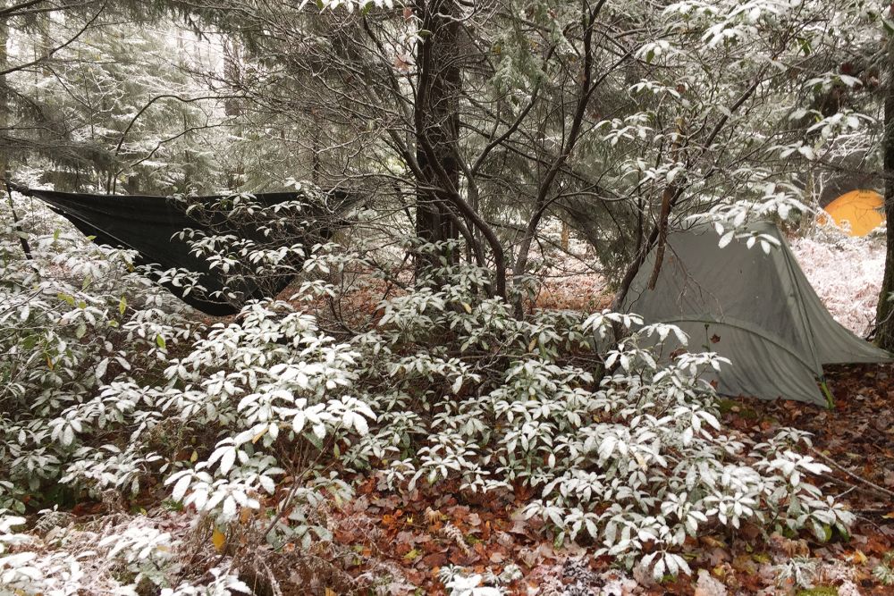 头天晚上的雨到后半夜小了很多,但风越刮越猛。好在把帐篷支在了背风的树底下,否则非被这时速32迈的大风掀翻不可。不想把泥泞的登山鞋放在潮湿的帐篷里,就放在了帐篷外的雨搭子的翅膀下,结果是风吹雨打进靴子里,第二天早上起来穿时里面都是水,比上次徒步AT的时候蹚水的湿度程度没好多少,再加上气温剧降,穿进去冷的直打冷激冷。Julie说,你套上塑料袋子在[