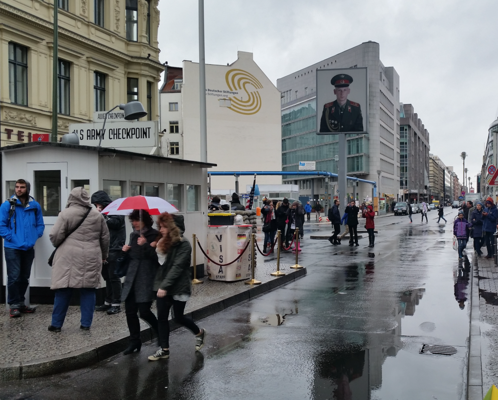 从柏林墙出来,开车直奔著名的查理检查站。它是柏林墙三个边境检查站(代号A,B,C,Charlie代表C)之一,当时盟军的检查站和外国人进出东西柏林间的惟一通道。这里有两个人扮成美国大兵与游人拍照,2欧元一照。检查站旁边的柏林墙博物馆。从查理检查站离开后就奔胜利纪念柱(VictoryColumn)而来。自己开车就有这样的好处,行程由自己自由决定。我们这样走并非最佳路线。但[