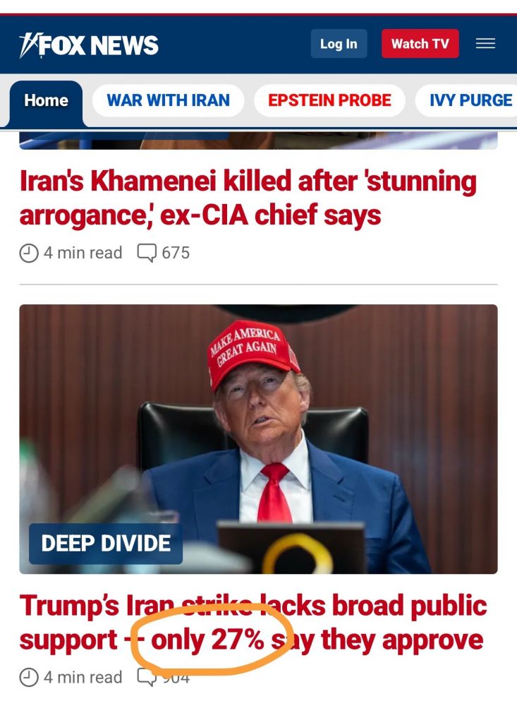极右媒体Fox的poll,仅有27%支持川普打伊朗。