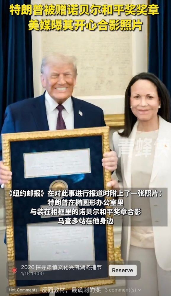 我擦,诺贝尔奖的评委们费尽心机挑选出来的“和平奖”得主,竟然将自己的奖章转送给了侵犯自己国家,穷兵黩武,丝毫不尊重国际法,而且是诺奖评委们非常不喜欢的川普。