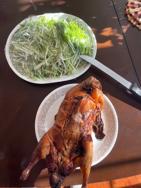 爪家吃烤鸭的流程,是四哥切葱,蒸饼,四嫂片鸭(骗鸭)。