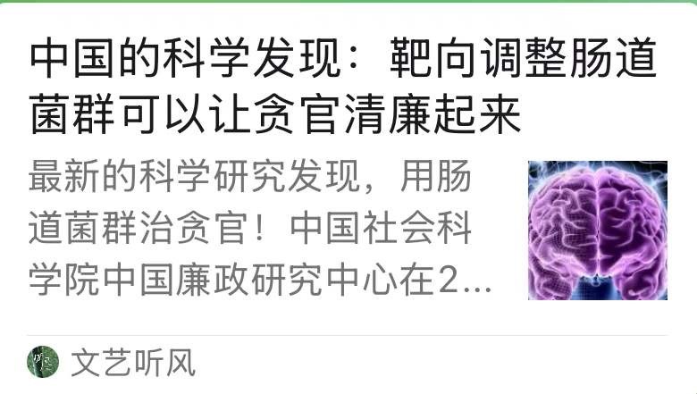 中国科学家发现,靶向调整肠道菌群,可以让贪官清廉起来。。。。