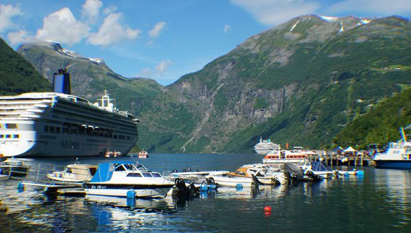 7月20日,碧蓝的天空散落着朵朵白云,老天知道这个陆地游是我们此次的重点,给了我们一个大礼:晴天。邮轮缓缓地驶入盖伦格峡湾(Geirangerfjord),这是挪威sunnydus深入大陆最深的峡湾,也是本次行程中最美的峡湾。它被列为世界文化遗产,全长16公里,两岸山势峻秀壮丽,自然雄伟的陡[
