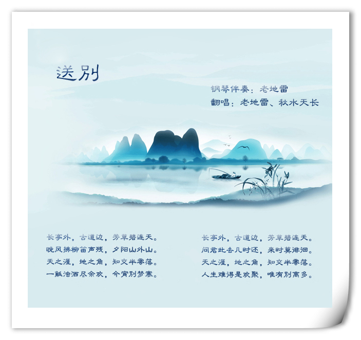 两年多前我弹了一个《送别》的钢琴伴奏,承蒙好多位歌友的喜爱,一下子有了15个版本,今天我挑选几个也在唱坛发歌的歌友们演唱的《送别》,各有千秋,不分伯仲,我全部爱!