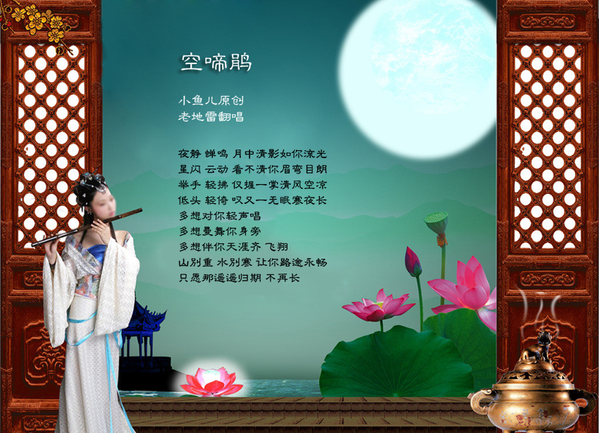我非常欣赏我的好友小鱼儿的音乐才能,从演唱到创作是个全才,就是这样的高水准,中国原创基地上一首歌的播放数高达六位数的业余音乐人却低调得很。去年我演唱了她的原创作品《空啼鹃》,这首歌美到爆,不翻唱就睡不捉觉:)这首歌的作词作曲原唱以及和声演唱全是小鱼儿。编曲和声旋律设计是陈林。很高兴知道她最近的编曲水平也如日中天,离高水准的专业编曲[