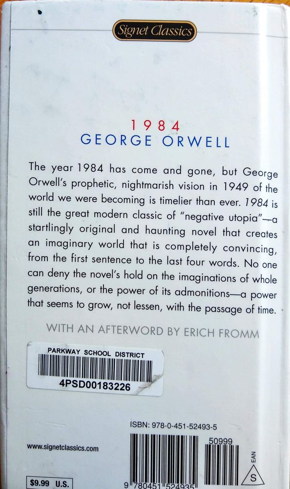 孩子推荐我读他们bookclub的书-GeorgeOrwell的《1984》。这本书描绘了二战之后的极权社会发展到1984时,极权政府对民众无孔不入的监控,缺衣少食的民众,毫无隐私,不容思考,连想都不可以的蝼蚁生活。