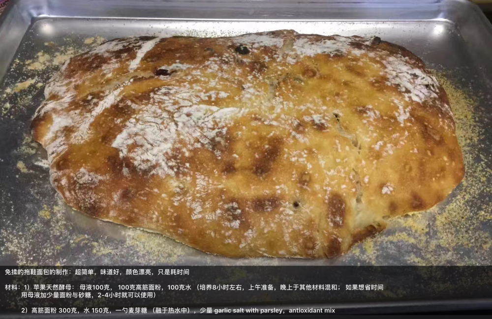 用的是自己培养的苹果天然酵母,制作简单,只是耗时间。1.培养starter。2.和面,50%的水和面粉比例,比一般和面的水分高。放置12-18小时,取决于室温。3.塑形(shape),即转移到铺着烘培纸或玉米粉的烤盘上。4.二次发酵(rising),1-2即可。5.放入预热420F的烤箱中20-25分钟即可,烤箱中底层放入装有热水的烤盘,中途可朝面团喷水,使得面皮有脆壳产生。[