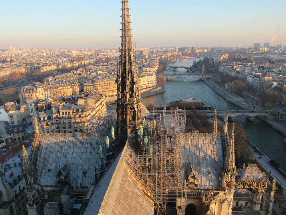 下午听到巴黎圣母院的大火消息,非常震惊,叹惜。那雄雄烈火摧毁了巴黎最古老的中世纪(850年)教堂顶。我一月与女儿游巴黎时就住在圣母院旁。我们首先参观的是圣母院,并登上了顶。当时教堂顶正在维修,虽搭了不少角手架,上面的各种塑象清晰可见。教堂的尖塔屹然耸立。如今,圣母院顶被烧成了这样(照片来自网上)。令我们无比悲伤,叹惜。[