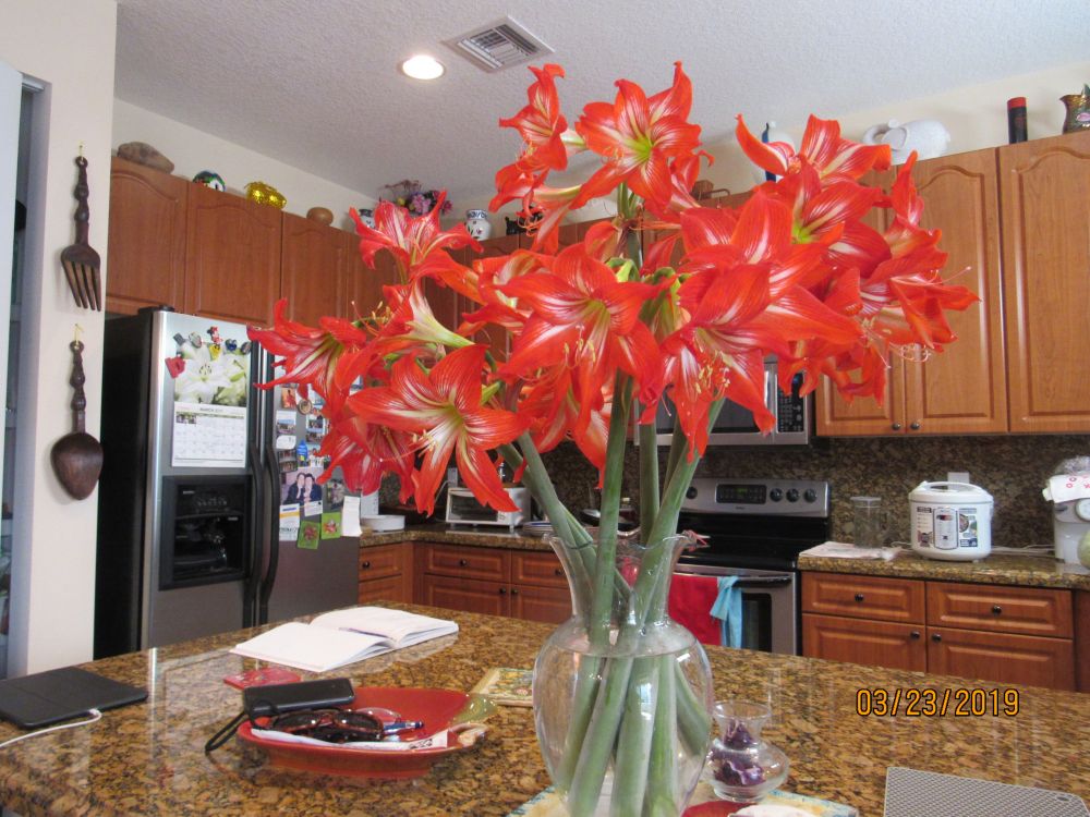 喜欢在院里种花,观察,欣赏。同时也喜欢随意用院里的材料插花。今年院里的朱顶红开得特多特艳,将风吹倒了的朱顶红花长长短短地剪下,放在花瓶里,给我喜气洋洋。