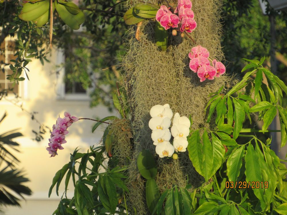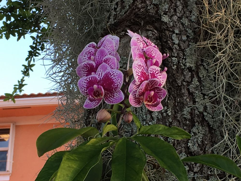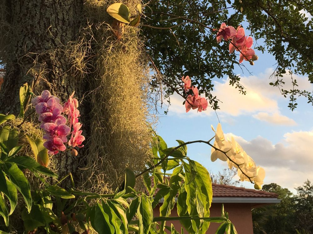 上面几张照片是在我院里拍的。那树是南方橡树(southernliveoak),兰花是一年前梱上去,不久前开了兰。它们就是我的“兰花树”。在黄昏祥云与柔和的阳光下,它们象似童话世界中神密的五彩花园,又象似一幅华丽的天然油画,……。这景色真切,就在眼前,让我感受到一种特别的韵味和美感,一种特别的享受与自豪。