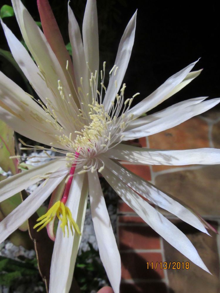 约两周前的一天,晚七点左右出外散步,发现花蕾微微绽开。直到九点半左右,花朵完全开放。第一次见到迎接感恩节的昙花,第一这样全程跟踪,很是兴奋。