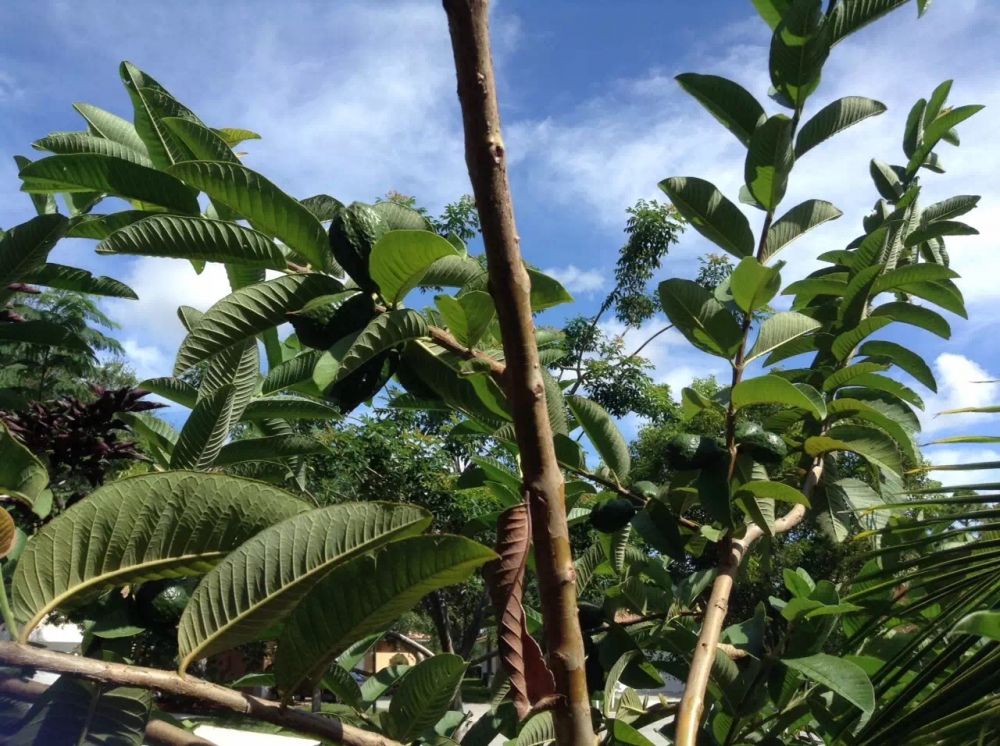 我院的番石榴(guava,或appleguava,Psidiumguajava)是几年前从附近的Lowe’s买其它植物时顺便买的.番石榴是典型的桃金娘科的植物,喜光耐旱,低管理,生命力非常.这几年它在我院经历了不少“苦难”:移动过两次位置;多次感染白粉湿真菌;被台风吹倒后,主干被砍到地面…….可它每次都挺过来了,今年还结了不少果。我的从加勒比海长大的邻居们可喜欢它的[