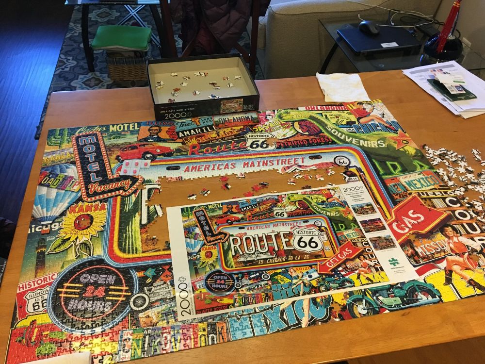 周一女儿上班,我在家打扫清洁,整理房间,做做饭.女儿喜欢playpuzzle,饭桌上摆的是一个2000块的美国著名的Route66puzzle,快完成了.