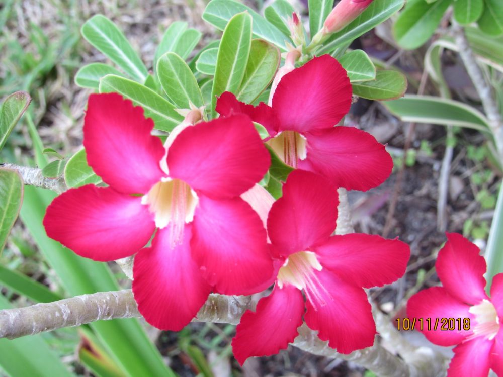 沙漠玫瑰,desertrose(Adeniumobesum),有很多杂交品种,花的色彩鲜艳。我院有一块特别向阳的地方,五六年前特地从Lowe’s买了三种不同颜色的沙漠玫瑰栽在那里。这几年,有两棵因锄草的不小心,一次又一次地伤害了它们。另一棵呢,它的叶毎年都被蝴蝶幼虫一次又一次地全部吃光。我担心它们能否存活。然而它们都顽强地支撑着,活着,今年居然鲜花盛开。顽强的生命力![