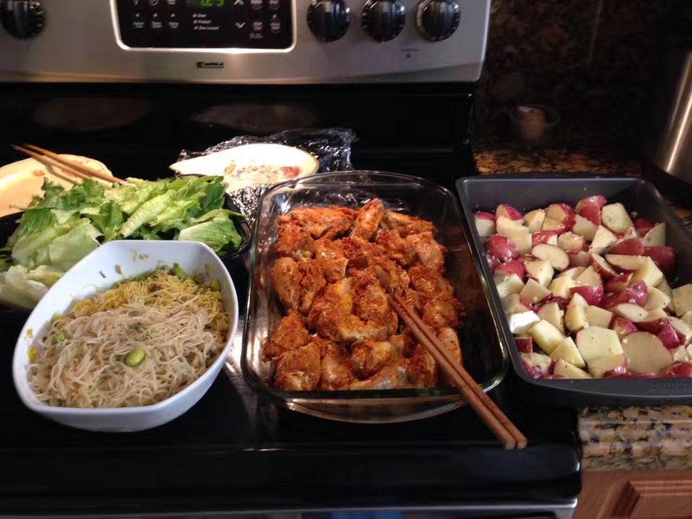 对我这种不会做烹调的人,一直觉得接待老外朋友比中国朋友容易多了。烤调好料的鸡腿,烤土豆,炒粉条,加个青菜,量多点,几个老外朋友吃得高高兴兴。