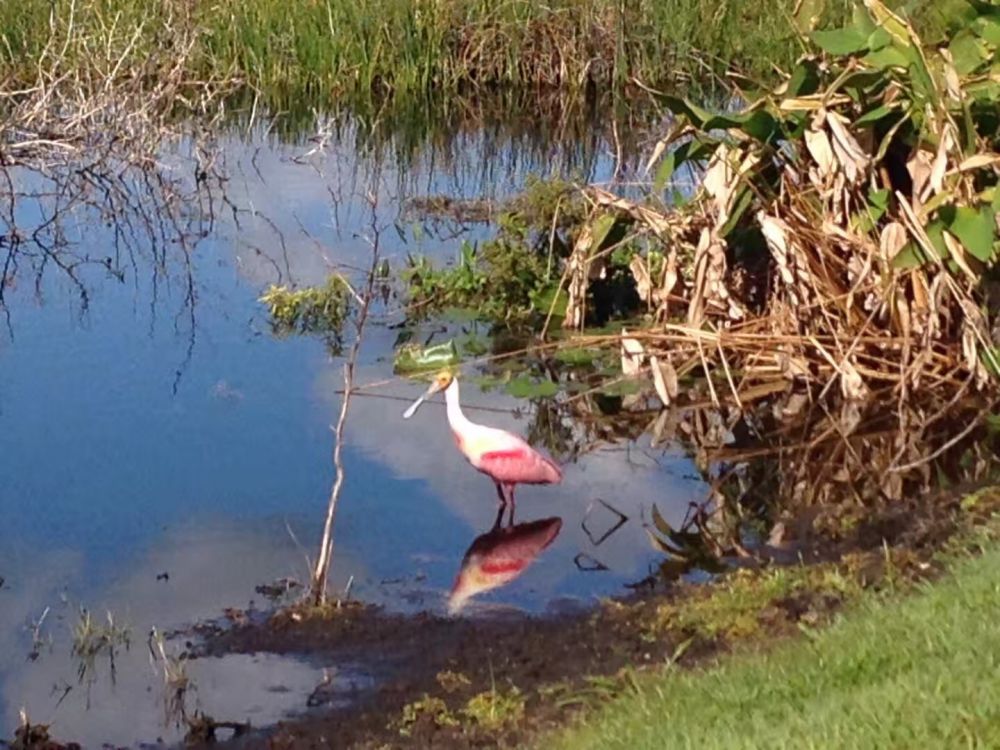 春季是做院里的活的好时光,不冷不热。可也是户外活动的时候。不想做院的活时,就看鸟去。我们这里湿地公园多,大大小小。俗话说,山不在高,有仙则灵。同样,湿地公园不在面积大小,有鸟就有好。附近有几个捐赠的人工湿地,面积不大,但却吸引了不少的鸟。在一个很小,很多当地居民都不知道的公园,运气好!第一次近距离地看到:粉红色spoonbill鸟。
