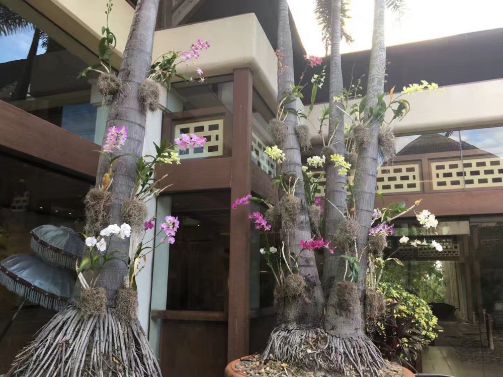 兰花系热带雨林攀附植物,喜阴喜湿。其气生根从空气中获水分,从树干上获营养元素。下面是我一位朋友在奥兰多附近照到的梱树上的石斛兰。还有一位朋友自种石斛,花多鲜艳明亮。石斛属兰科,花美不胜收。试试梱兰花于树,还兰花于其原本生境,花更艳,花期长,你更省事。