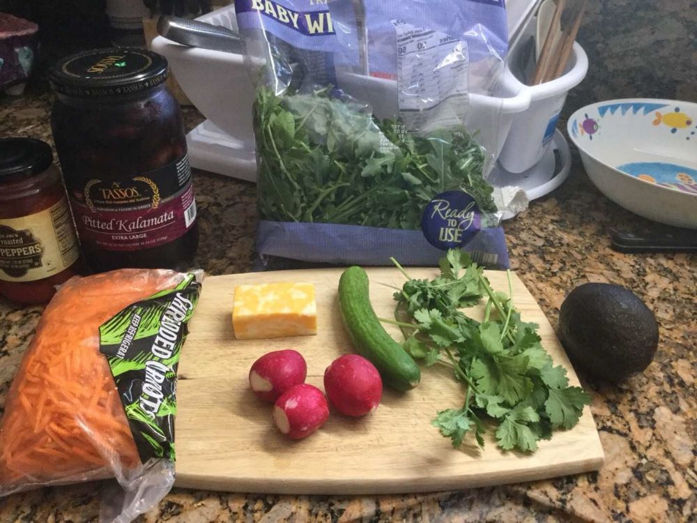 小时候听一位朋友说过,“外国人吃的是肉,我们吃的是草”。到美国后,每每想起此语,总觉不是滋味。现在好了,生活提高了,我们还自觉吃草呢!当然,以前的草与现在草相差太大了。如我的晚餐色拉包括:1)草类有牛油果,野arugula(芝麻菜,大袋里的)菜、香菜、小黄瓜、小红萝卜、奶酪、与葫萝卜絲。2)调料类从左到右有自烤混合坚果(almond、pecan、核桃仁、[