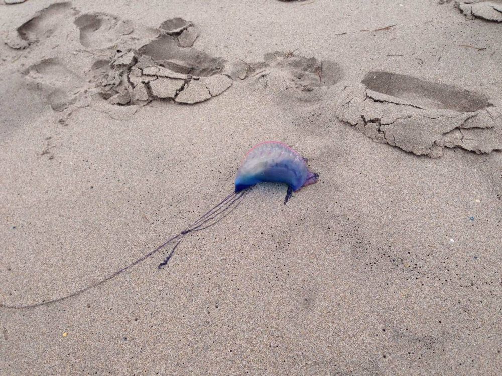 在佛州住了二十几年,不久前才第一次见到这蓝色的葡萄牙战艗水母(PortugueseManofWar),其大气泡里充满了近14%的二氧化碳。是从大西洋那边由海浪冲过来的。它看似漂亮,但其长长的尾却钉人极痛,难怪连海鸥都离