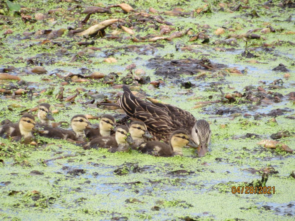 春季观鸟看宝宝,当然是可遇不可求。昨天在又一人工湿地公园,第一次遇上了四家萌萌鸭宝宝们,情景难忘!1mottled鸭妈妈与萌萌宝游过来了,阵容不小,七只。只见妈妈开路,还在不地讲着什么。2远处一有更萌的五宝宝与mottled鸭妈妈站在那里。过了一小会,其中一位萌宝似乎在说什么,只见萌宝们都蹲下了,但眼睛还大大地睁开。一小会儿后,它们闭上眼睛,进入了梦乡。[