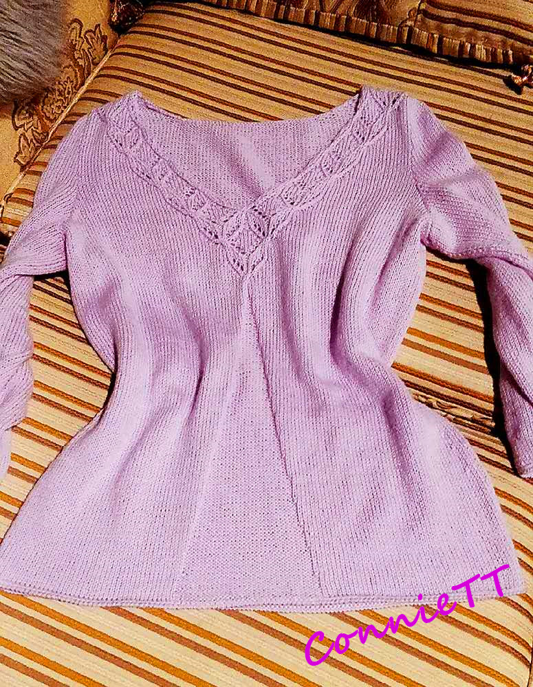 拖拖拉拉是我的一个很大的坏习惯。这件衣服织完了身子后,就开了新的衣服,这件搁下来了。后来竟然找不到图解了。没法了,我就到一个大的编织群里寻图解。立马有高手给我把图解扔过来了。这次麻溜的吧。赶紧织了袖子,钩了胸前的小花。弄好后发现领子有点太开阔了。又整改了一下,现在比较合适了。我喜欢这个淡淡的紫色。也喜欢这个款式,胸前稍一点缀,立马[