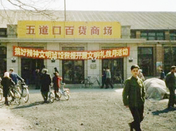 夜里做了个梦,在一条铁路旁徘徊…走到一个路口,铁路栏杆落下来…一列火车从远方驶来…车灯越来越近…就醒了。朦胧中,想到五道口,也有一条铁路,曾多少次栏杆落下来等火车通过,勾引起无数回忆。那时家住中关村,离五道口很近。后来工作、读研都在五道口附近。在网上找到一张五道口商场的老照片,十分亲切。以这张照片为坐标,面对商场,回忆[