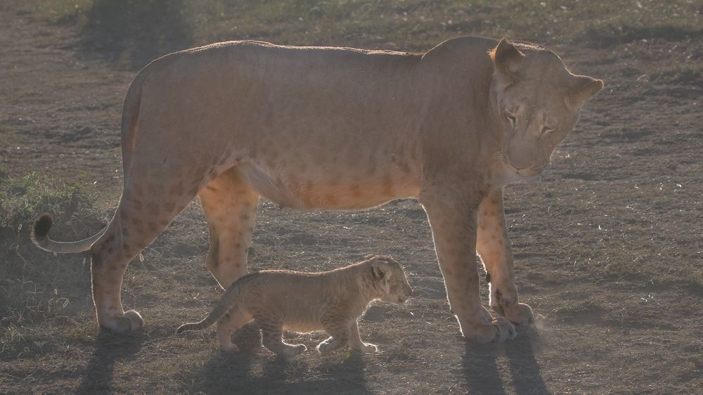 狮子妈妈带着刚刚蹒跚学步的三个星期大的小狮子出行。小狮子太小了,妈妈很不放心,会走走停停,再回过头来看它是否跟上来了。