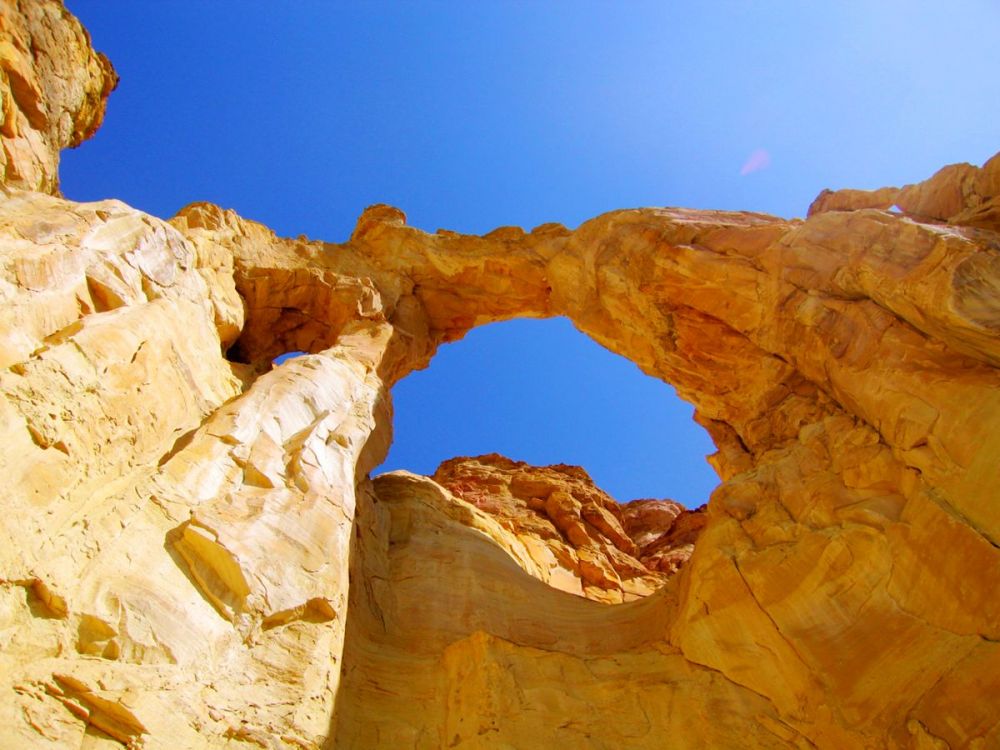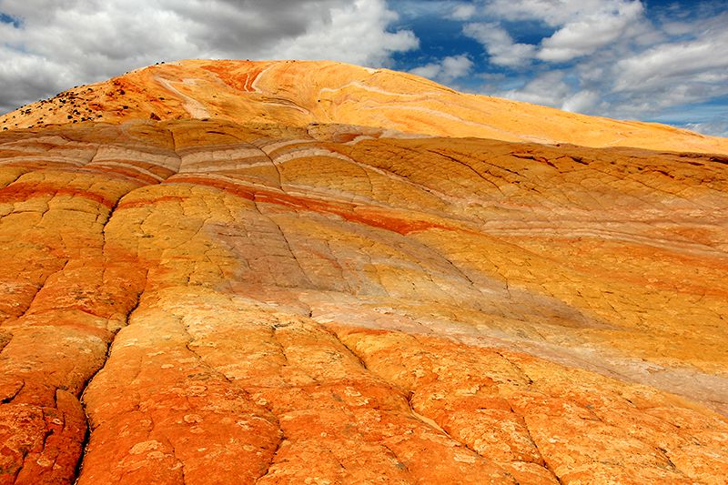 这是一座较特别的山岗,由地底溶岩向上涌出形成,凸出地面穹圆形的岩层主色是黄色,但也有深浅的红色,橙色,各种岩层表面隆起的直线或波浪形条纹,应是冰河年代风与雨雪切割而成.它位置在棉花木道土路西侧约1.2里,车停于路边一些较宽的空地,徒步向西方向走,越过路边的干河床,不远,就会见到黄岩岗,走得快时,约45分钟到达,走得慢约1小时多一点,岗上圆滑岩上,少见树映.好容易[