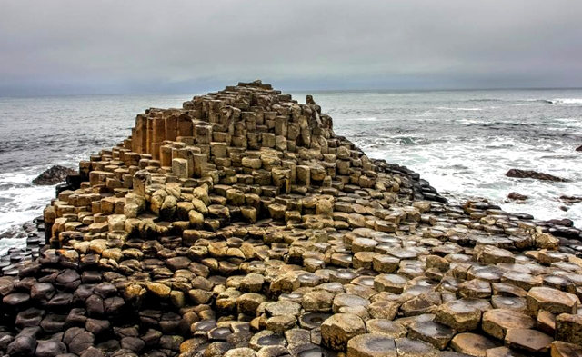 巨人堤道位于北爱尔兰贝尔法斯特西约80公里外大西洋海岸.这是世界地质奇观之一.约6000万年前火山爆发的结果,涌出的玄武溶岩迅速冷却,收缩和分裂形成六角柱状.有专线大巴载游客到此一日游.由司机导游带领,据他讲,这里的柱岩被发现于1692年.[