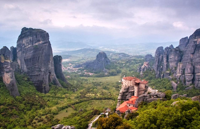 希腊,其中一座最大型的修道院建筑群,位于海拔313米高耸的沙岩岗上.四侧均为悬崖峭壁.直至17世纪,贷物和人均需由绳索和吊篮进出修道院.有与世隔绝之感.现今.人可经由石崖凿出的楼梯进入,运送的补给物仍用吊篮.美国的二战电影,占士邦007电影等多次在此拍摄取景.更是希腊最吸力的旅游景点.1988年被联合国列为世界遗产.左侧是近代开的石梯级供游客使用,右塔顶上就是贷物进[