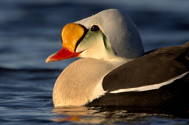 在阿拉斯加见得较多的水鸭品种之一,是这种绒鸭王.水鸭以雄性鸭羽毛色泽较艳,绒鸭也是如此.雌性绒鸭色泽较浅,羽毛是这样的.[