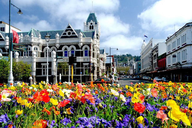 达尼丁(Dunedin)为新西兰东南部的一座滨海城.港湾可停邮轮,住有不少准备去峡湾国家公园的游客.我是跟随儿子到此城参加工作会议而来的.他去开会,我去逛城.此城并非新西兰大城.全国排行只是第五.人口约12万,由于气候适中,花草极为茂盛.是一个美丽的花城.[