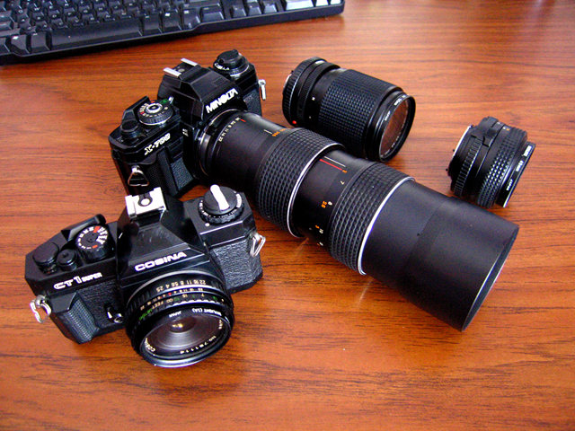 整理书旁时发现的旧相机,左边是确善能(Cosina)CT1Super相机.右边长境者为万能达(Minolta)相机与配备镜头.确善能CT1Super.40mm镜头.是我离开中国移民香港,自己拥有的人生第一部相机.购于1973年,距今45年历史.确善能因价平,简单好用.在打工族中极为流行.万能达(在中国译成美能达)X-700.50mm镜头.也是日本相机.1982年出产.我同年购入.是移民美国后,回港探亲时购买的,是自己人生第二部相机.[