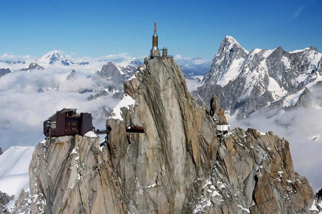 法国夏蒙尼.建有一条到达南针峰的索道.南针峰是法国境内阿尔卑斯山脉其中一座山峰.高3842米.从起点至AIGUILLEDUMIDI(第一个观景台)只需20分钟时间.第一观景台建有咖啡馆,礼品店及天险桥,可过对面山脊,再从山中隧道通向南针峰登顶电梯,最终到达3842米高的峰顶.峰顶建有一枝如火箭外形的铁塔,远看如针.故有南针峰之称.铁塔脚下是观景台(第二个观景台).在此可360度可见到阿尔卑[