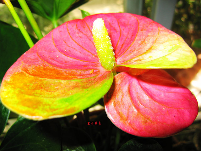 这株又称蜡烛花的多年生草本,高16寸.单花顶生,心形,鲜红色,肉穗花序圆柱状,由初级的绿色渐转黄,红色.是我家观赏花卉中的盆栽植物.[