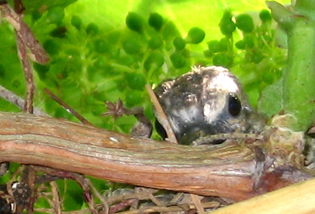 由4月中旬开始,后院葡萄棚上来了一对斑鸠夫妇.由当初的淡情说爱至共筑爱巢,生蛋,孵蛋,至小斑鸠出现,我全程都在拍摄.迎接这小生命来临.鸠妈迎巢期间,我也曾帮了一把.在巢底部插入较硬实的筷子作根基.鸠妈产下2蛋,也全孵出.但其中经历过两场大风雨.最终只有一只存活下来.鸠仔在鸠妈右侧.这是存活下来的鸠仔,鸠妈离巢寻食时,让我有机会与鸠仔见脸.[