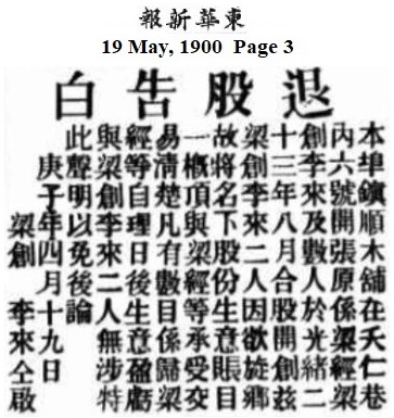 雪梨唐人街雜錄(23)2.對唐人街影響深遠的保皇會康有為在變法後出走加拿大,並聯同葉恩成立保皇會(全名為“海外保救大清皇帝會”)。該會成立後,康有為和葉恩分別致函梅光達,希望梅光達能“聯絡各埠,互相通識,合大會以救中國”(見東華新報1899年10月11日第2及3頁)。梅光達對此並沒有任何興趣,這在1900年2月21日東華新報中報導的“雪梨埠各義士認[