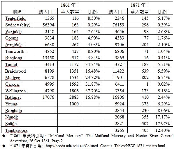 雪梨唐人街雜錄(15)要了解雪梨華人的變化,還得從人口的變動入手。下面的表格是先以1861年華人在該地區超過100人列表,再按該地區在1871年的數字來予以比較。1861年華人在紐省的總數是13021人(12988),1871年則是6842人(7220人),括號的數據是依據“AUSTRALIANBUREAUOFSTATISTICS”:cat.no.3105.0.65.001AustralianHistoricalPopulationStatistics,TABLE66.Population,sexandcountryofbirth,NSW,censusyears,1846-18...[