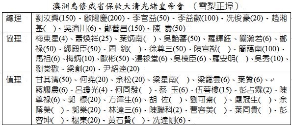 雪梨唐人街雜錄(22)一.關於1892年雪梨華人的派系1892年9月,在澳洲殖民地生活了40年的老華商維記(Mr.WayKey)在雪梨病逝,他的遺體經“慈南Tsinan”號船運回香港再轉運到家鄉埋葬。在雪梨的送殯儀式中,有超過3000華人(以DwoongGoongFaction為多)參加,包括7個不同派系的華人(關於他的送殯儀式,請參閱以前的文章)。一直以來對於這7個派系的中英文名稱及歸屬都沒能弄[