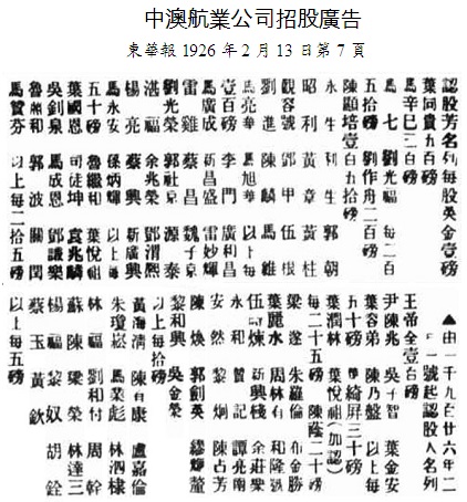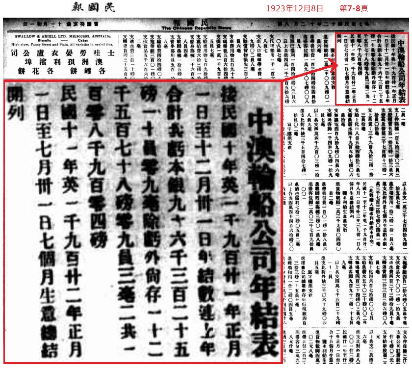 23.一蹋糊塗1921年1月澳洲總領事館稱郭順請中國政府補貼華丙船,否則“恐有破產之虞”(“外交部通商司商務科公函”:1921年1月12日)。1921年2月26日中澳(郵船)公司宣佈招新股(“中澳船行增招新股宣言”:東華報1919年2月26日第6頁),宣稱“為擴充生意﹑為挽回利權﹑為洗雪恥辱﹑為尊重人格﹑為保存國旗”。公告以“中澳船行董事局同人&rd[