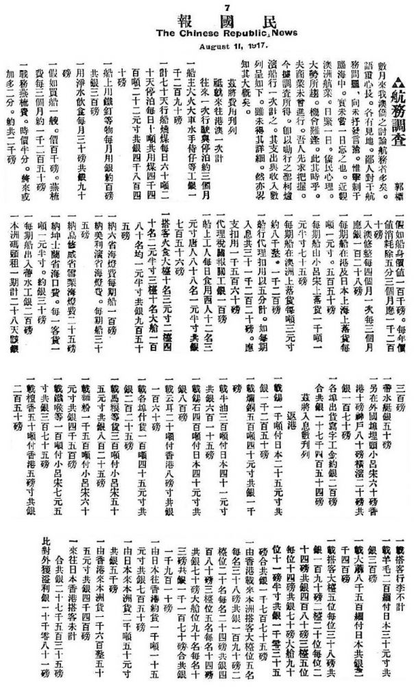 (這個專題在開始就用名錯誤,實際上應為“中澳郵船公司”,上兩文在這裡已改不了,自現在起予以更正,並致歉意!)3.辦理航業的輿情再起第一次世界大戰之前行走澳洲香港日本的郵船公司四間,能搜集各船的資料如下: 輪船公司 中文名稱 英文名稱 噸位 代理 德國書信輪船公司 Nord-DeutscherLloyd 皮連士昔之士文 [