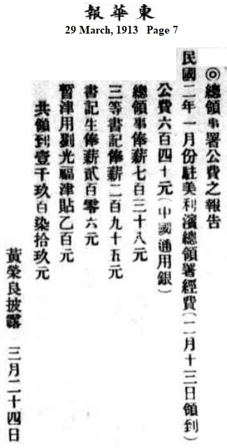 中國駐澳洲第一任總領事梁瀾勳“再澳洲設立總領事,前經臣部奏准揀員試署在案。所有該領事館開辦經費暨川裝等項銀両,照章均應造冊報銷。茲據駐澳洲總領事梁瀾勳將收支開辦經費暨川裝等項銀両造具清冊到部。查冊開舊管無項,新收江海關道先後撥庫平銀一萬九千七百両,除預撥三個月薪公銀五千七百二十両照章毋庸冊報,外計收庫平銀一萬三千九百八十両,開除[