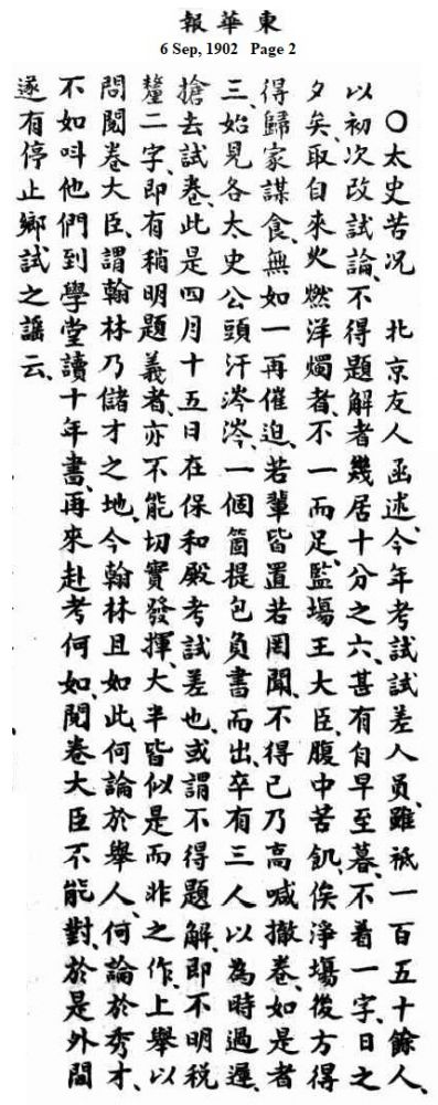 今天不想寫須多查資料的東西,翻起百多年前的舊報紙看看。當看到東華報在1902年9月6日第2頁“太史苦况”的報導,暗自低頭幻想當年的場景,不禁感觸百生。且照抄原報導:北京友人函述,今年考試試差人員祇一百五十餘人。以初次改試論,不得題解者幾居十分之六;甚有自早自暮不着一字。日之夕矣,取自來火燃洋燭者,不一而足。監場大臣腹中苦飢,俟淨場後方[