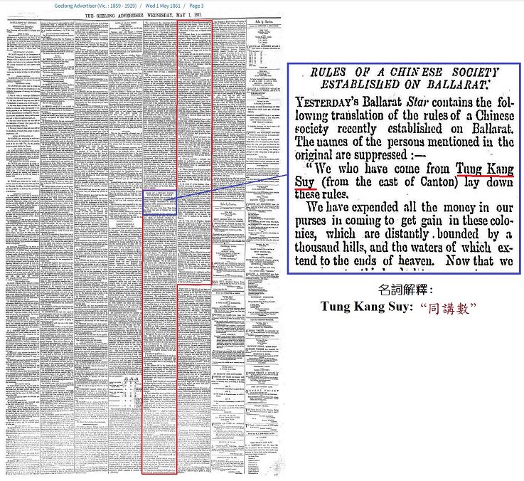 华人的自我约束及与洪门的差异参阅许多澳洲华人历史的书籍及文章几乎都没有提及墨尔砵四邑华人在1854年为Ballarat淘金所定下的规则,或许可以这样说,为订这规程的时间也是现在将四邑会馆成立的时间。1854年是华人规模性来维省淘金的年份,其间绝大部份正式入境(维省尚未征收入境税),并以四邑人为主。这规则名为“孖辣华人社会章程”RulesofaChineseSocietyEstablishe[