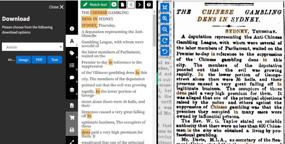 澳洲國家圖書館網站中的資料可以直接閱覽或下載PDF(或JPG),包括完整Issue﹑整頁Page﹑文章Article都可以。